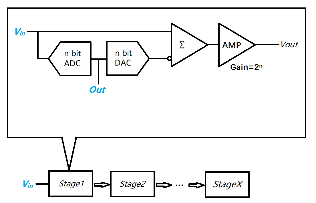 流水线型 ADC 通常由多个相同结构的子单元组成,每个子单元包含一个 ADC,一个反向DAC,一个减法器,一个固定增益的放大器构成,子单元中的 ADC 多为 Flash 型,也有 SAR 型。