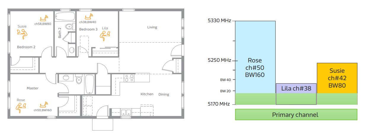 三个AP均以5G 低频段作为主要信道。其中,使用者Lila使用的是信道38,带宽为40MHz;而使用者Rose则使用的是信道50,带宽为160MHz。根据理论计算, Lila所能达到的最高吞吐量仅为Rose的四分之一。在这种网络架构下,Lila 注定要经历更长的等待时间,同时也会减少其他两名对网络带宽有较高需求用户的传输时间。