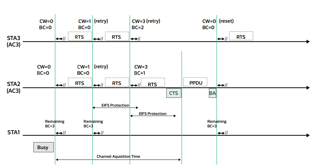 通过这些操作,高优先级的AC在与其他AC竞争信道访问权时,能够持续获得优先权。同时,当发送RTS的站点遇到冲突时,可以在EIFS周期内重传RTS,因为在此期间暂时退避 (backoff) 的Wi-Fi 终端不会占用信道资源。