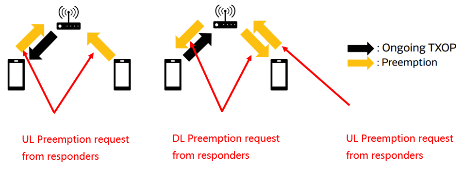 当AP正在进行上行传输机会 (UL TXOP) 时,仅允许Wi-Fi 站点 (Responders) 发出下行传输机会 (DL TXOP) 或另一个上行传输机会 (UL TXOP) 的抢占请求。