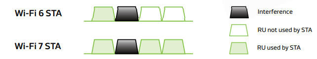 MRU 的另一个优势在于,它能够降低干扰对可用频道的影响,并进一步提升OFDMA的效率。前导码打孔(Preamble Puncturing)技术在Wi-Fi 6中已被引入,而在Wi-Fi 7 中,该技术结合MRU的特性,使其工作机制变得更加灵活。在Wi-Fi 6的架构下,执行前导码打孔后,其RU仍需通过OFDMA机制分配给“多个”用户,这意味着在单一用户的使用场景下,前导码打孔无法发挥其优势。然而通过MRU,执行前导码打孔后的RU可以全部分配给一个用户,并且即使在不连续的频谱 (non-continuous spectrum) 环境下,也能够执行前导码打孔操作。