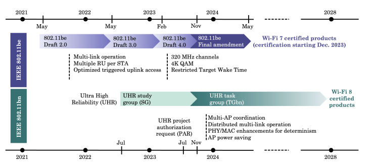 图2. IEEE 802.11be (Wi-Fi 7) 与802.11bn (Wi-Fi 8) 标准化工作的时间表(图片来源:arxiv.org)