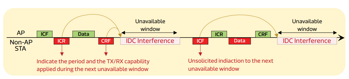 IDC | 设备内共存 | 提升同一无线设备同时使用多种无线传输装置(如Wi-Fi和Bluetooth)时的性能,增强Wi-Fi AP(接入点)或多功能网络路由器(如智能家居AP或物联网网关)的效率与连接稳定性,从而提供更佳的多模无线传输共存体验。 |
