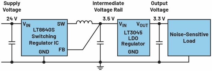 图1.由高效开关稳压器和下游线性稳压器组成的电压转换器。