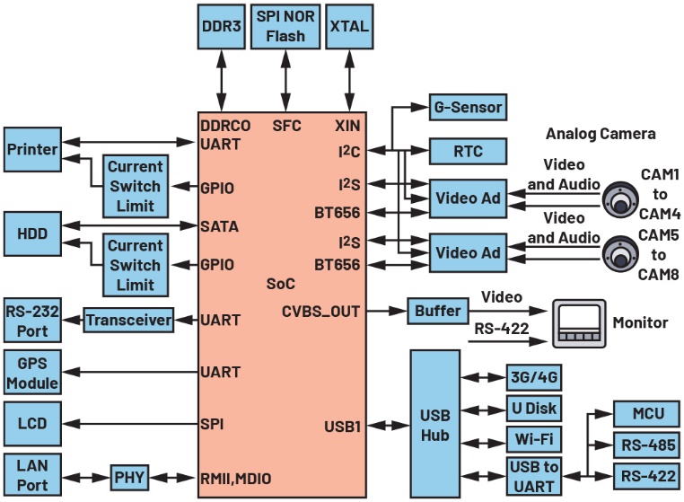 图5展示了一种常见的DVR硬件解决方案,其中的主要信号链路如下:外部模拟摄像头的模拟视频信号传输至视频模数转换器(ADC,又称视频解码器),由ADC将模拟视频信号(即复合视频基带信号(CVBS)、模拟高清(AHD)信号或传输视频接口(TVI)信号)转换/解码为数字视频信号,例如BT656。通常,CVBS可传输的最大分辨率为576i,而TVI则能传输8K12.5p的信号。模拟音频信号的处理方式与之类似,会被转换为I2S格式。一般而言,片上系统(SoC)本身配备视频输出端口,用于输出用户交互界面的视频流,通常为HDMI®、VGA或CVBS接口。