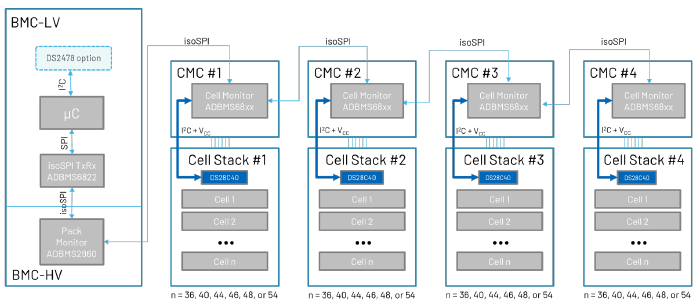 在ADI有线BMS中,电池管理控制器通过ISO SPI与电池模组通信。ISO SPI协议允许两个隔离器件进行串行外设接口(SPI)通信。ISO SPI具有I2C隧道能力,支持与DS28C40连接,如图9所示。通过这种通信媒介,BMC可以单独验证每个电池模组的身份。有关ISO SPI的更多信息,请参阅本文。