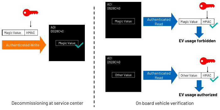 为此,必须确保这些退役电池在其性能已不符合电动汽车要求后,不再重复用于其他车辆。也就是说,应以安全且不可逆的方式对电动汽车电池模组进行退役处理。除了电池模组认证之外,DS28C40、DS28E40和DS2478还支持安全退役。一个很直观的想法是:我们可以在电池模组附加的芯片中存储一个“魔法值”(即任意已知的预设值),利用它来判断电池模组是否仍可用于电动汽车,还是已经退役。这种简单方法只有在满足以下条件时才有意义: