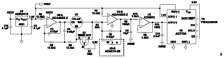 对于必须测量气体浓度ppm比例的应用,使用ADA4528-2和ADR3412使得电路性能适合与16位ADC接口,例如AD7790。