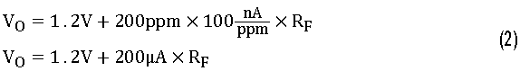 公式3显示使用65 nA/ppm的传感器典型响应时,电路输出电压与一氧化碳的ppm所呈现的函数关系。