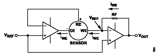 放大器U2-A从CE引脚吸取足够的电流,以便在传感器的WE和RE引脚间保持0 V电位。RE引脚连接到放大器U2-A的反相输入,因此其中无电流流动。这意味着从WE引脚来的电流,随气体浓度呈现线性变化。跨阻放大器U2-B将传感器电流转换为与气体浓度成正比的电压。