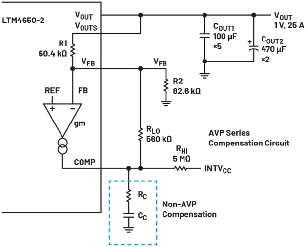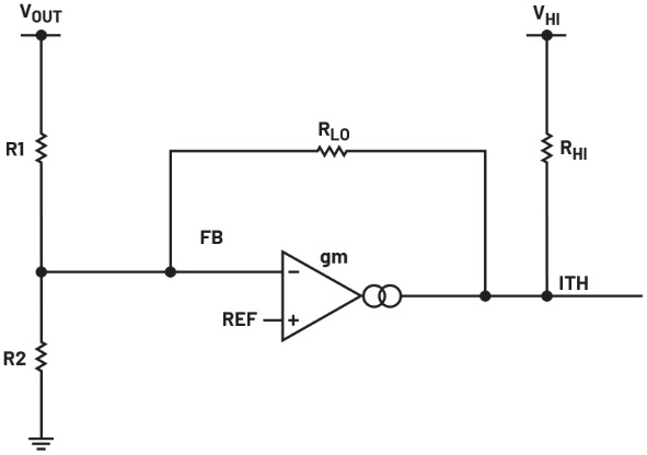 图2显示AVP串联补偿电路。内部基准电压(VREF)和VOUT反馈分别连接到误差放大器的正输入和负输入。与RHI连接的VHI(或INTVCC)向放大器输出(ITH或COMP)提供适当的直流电压,以防止输出进入饱和状态。RLO(反馈电阻)位于输出(ITH)和负输入(或FB)之间。因此,RLO决定了gm放大器增益。RHI和RLO值应远高于R1和R2。