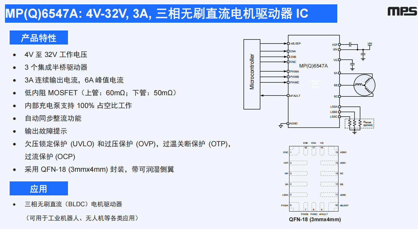 电机驱动芯片:以 MP (Q) 6547A 为代表,是全集成三相 BLDC 驱动芯片,峰值电流达 6A,内置低内阻 MOS 与同步整流功能,还通过 AEC-Q100 汽车级认证,兼顾小尺寸与高可靠性;同系列 MP6543 则进一步优化尺寸,适配紧凑空间;