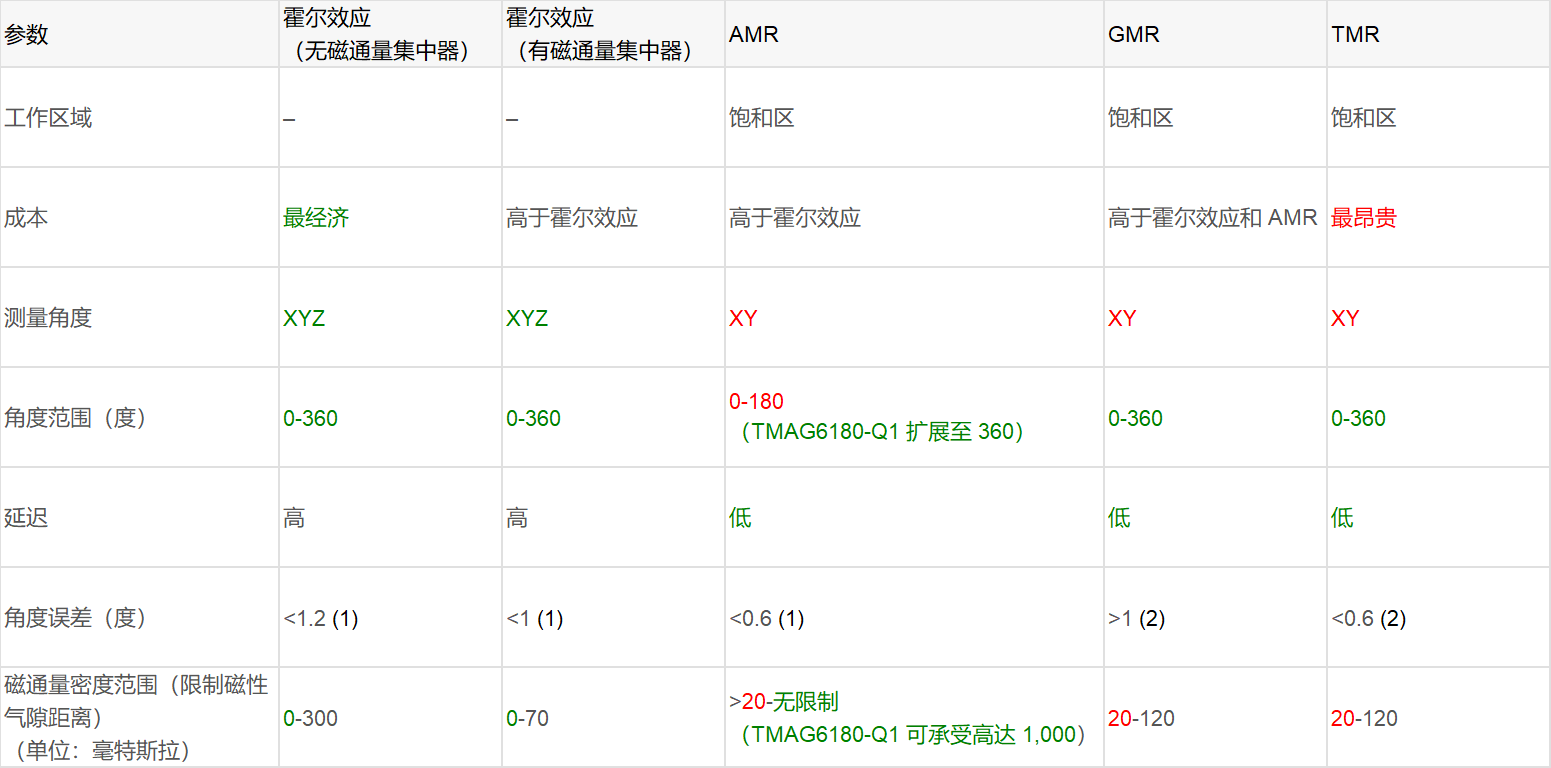 磁编码器提供了一种经济高效的方法,可用于检测旋转或线性运动,同时在含有灰尘、油和水的恶劣环境中保持抗扰性。磁性位置传感器可检测磁场变化,将磁场变化转换为电信号并生成输出信号。磁性位置传感器技术种类繁多,包括霍尔效应、AMR、隧穿磁阻 (TMR) 和巨磁阻 (GMR)。表 1