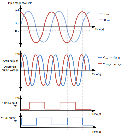 TMAG6180-Q1 2D AMR 角度传感器可测量磁场,并产生两个与这些磁场成正比的差分(或单端)电压输出。TMAG6180-Q1 的延迟低于 2µs,还可以更大限度地降低高速运动引起的角度误差。集成的霍尔效应开关可产生两个数字象限输出(Q0 和 Q1),从而将角度检测范围扩展到 360 度。结合正弦和余弦波形,Q0 和 Q1 数字输出足以确定绝对旋转角度。图 4 是 TMAG6180-Q1 的功能方框图,图 5 则显示了输出波形。