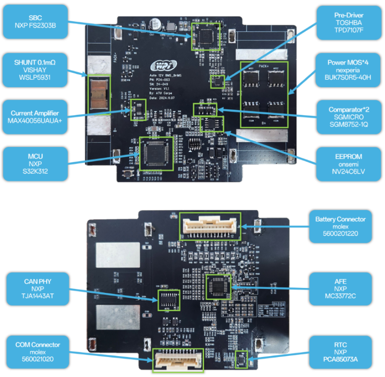 在采用NXP多款高性能芯片的同时,方案还选用了Molex 5600201020连接器、onsemi NV24C64LV EEPROM、Vishay WSLP5931大功率电阻器、安世半导体BUK7S0R5-40H MOSFET以及圣邦微电子SGM8752-1Q比较器等高品质周边器件,它们协同工作,共同构成了完整的解决方案。