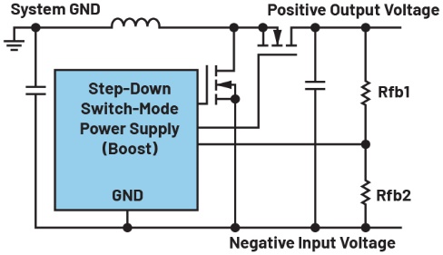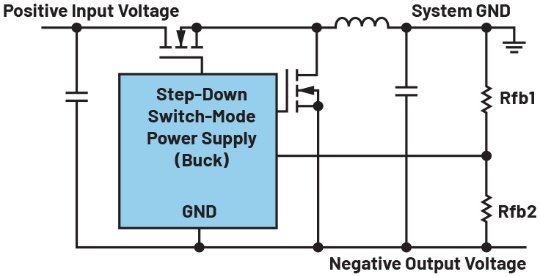 然而,有时电压需要反相。在大多数情况下,需要将正电源电压转换为负电压。这是为了给信号路径中的传感器供电,使其能够处理具有正负电压偏转的信号。例如,+5V和-5V用作运算放大器的电源,以处理信号电压。某些应用需要负电压来安全关断MOSFET的栅极。要从现有正电压产生负电压,图1所示的反相拓扑是合适的方案。其中,正电压被转换为负电压。这种电路结构简单,不需要变压器,可以利用标准降压型开关稳压器IC构建。降压型稳压器的输出电压连接至系统接地端,GND引脚电压产生负电压,该负电压可通过电阻分压器Rfb1和Rfb2进行调节。