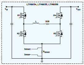 而LTM8054、LTM8055和LTM8056则将功率电感和RSENSE集成到µModule封装中,从而简化了客户的设计和布局工作,如图3所示。与LTM4607系列相比,LTM8055系列提供了更小尺寸的解决方案,但其输出电流受限于小尺寸集成电感,因此热性能和效率方面存在一定局限性。