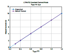 LTM4712可用作恒定输出电流源,因此适用于电池充电器或LED驱动器等应用。图10所示的示例电路设计用于提供稳定的10 A负载电流。