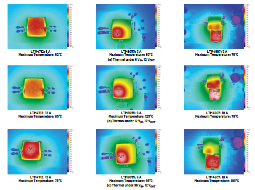 图6.LTM4712、LTM4607和LTM8055之间的热性能比较,TA = 25°C,无强制散热