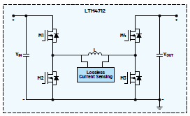 2023年,ADI发布了新款大电流、四开关降压-升压稳压器LTM4712。这是一款36 VIN(最大值)、12 A功率模块,采用高密度16 mm × 16 mm × 8.34 mm BGA封装。它采用ADI专有的先进组件封装技术,将高性能功率电感集成到封装中。图4显示了该模块中集成的专有电流检测方案。这不仅节省了空间,而且还有效减少了额外的功率损耗。该器件采用先进的降压-升压控制器和高级ADI封装,能够在宽输入输出电压范围内实现超高的功率水平、功率密度、效率和出色的热性能。