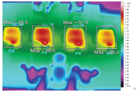 图8展示了无强制散热情况下的热图像,可以看到每个LTM4712的温度相似,表明均流效果良好。图9显示了48 A负载条件下每个器件上的IMON电压。每个IMON引脚的电压平均值约为0.7 V,表明每个通道的负载为12 A。这些测试均在评估板上进行。