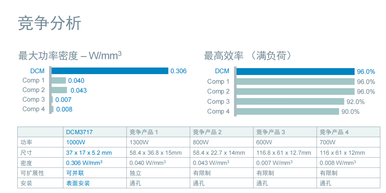 从功率密度来看,DCM3717 的功率密度达到 0.306W/mm³,而竞争产品大多在 0.007 - 0.043W/mm³ 之间。这意味着在相同体积下,DCM 系列产品能够提供更高的功率输出,为系统设计提供了更大的灵活性,满足了现代电子产品小型化、高性能的发展需求。在效率方面,DCM 系列产品同样表现出色,高达 96% 以上的转换效率有效降低了能源损耗,降低了用户的使用成本。