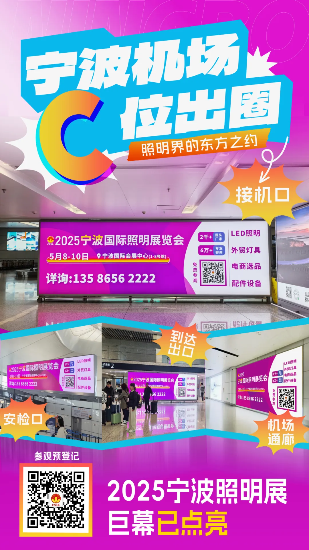 在宁波栎社国际机场直接C位出圈!接机口、机场通廊、安检口、到达出口的专属巨幕均已点亮,每天300架次航班见证宁波照明展全球影响力!