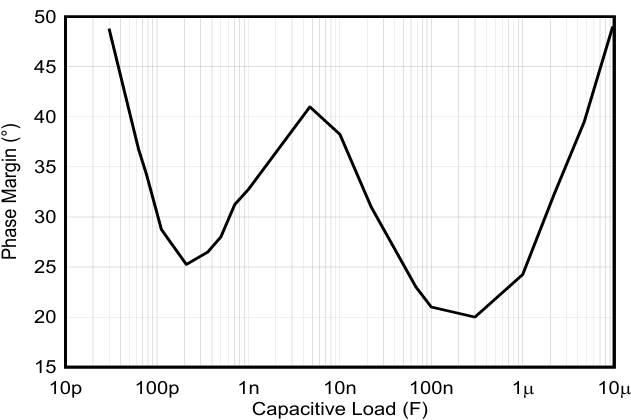 还有一种解决方案适用于不需要额外的补偿电路,或者添加补偿电路不可行的情况。德州仪器的OPA994 器件系列具有一个在整个容性负载范围内都保持稳定的特殊补偿结构,这是可以实现的,因为当输出看到不同的容性负载时,器件的带宽会发生变化。保持带宽始终低于输出阻抗和容性负载引入的极点,将保持放大器的稳定性,无论您在输出端放置了什么电容器。图 5 展示了在不使用外部补偿电阻器的情况下,不同负载电容值对应的相位裕度,该图取自 OPA994 数据表。