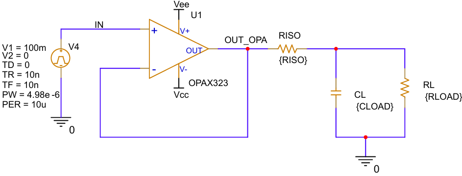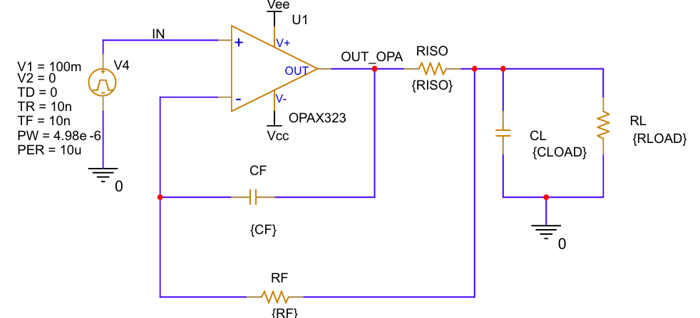 PSpice for TI 的强大功能之一是您可以设置、存档和共享仿真及公式以供后续原理图使用。由于 Riso 和 Riso 双反馈的评估是公式化的且易于重复,因此您可以利用这些模板工程,而无需记住在四种常见运算放大器电路上计算 Riso 或 Riso 双反馈电路的 Rf/Cf 的公式。只需下载 PSpice for TI 工程,放入您要分析的运算放大器,输入用于完成需要稳定的特定电路的参数,然后运行仿真以找到您所需的适当 Riso 值。这些工程还可以补偿因反相端子上的电容而不稳定或具有极大反馈电阻的电路。