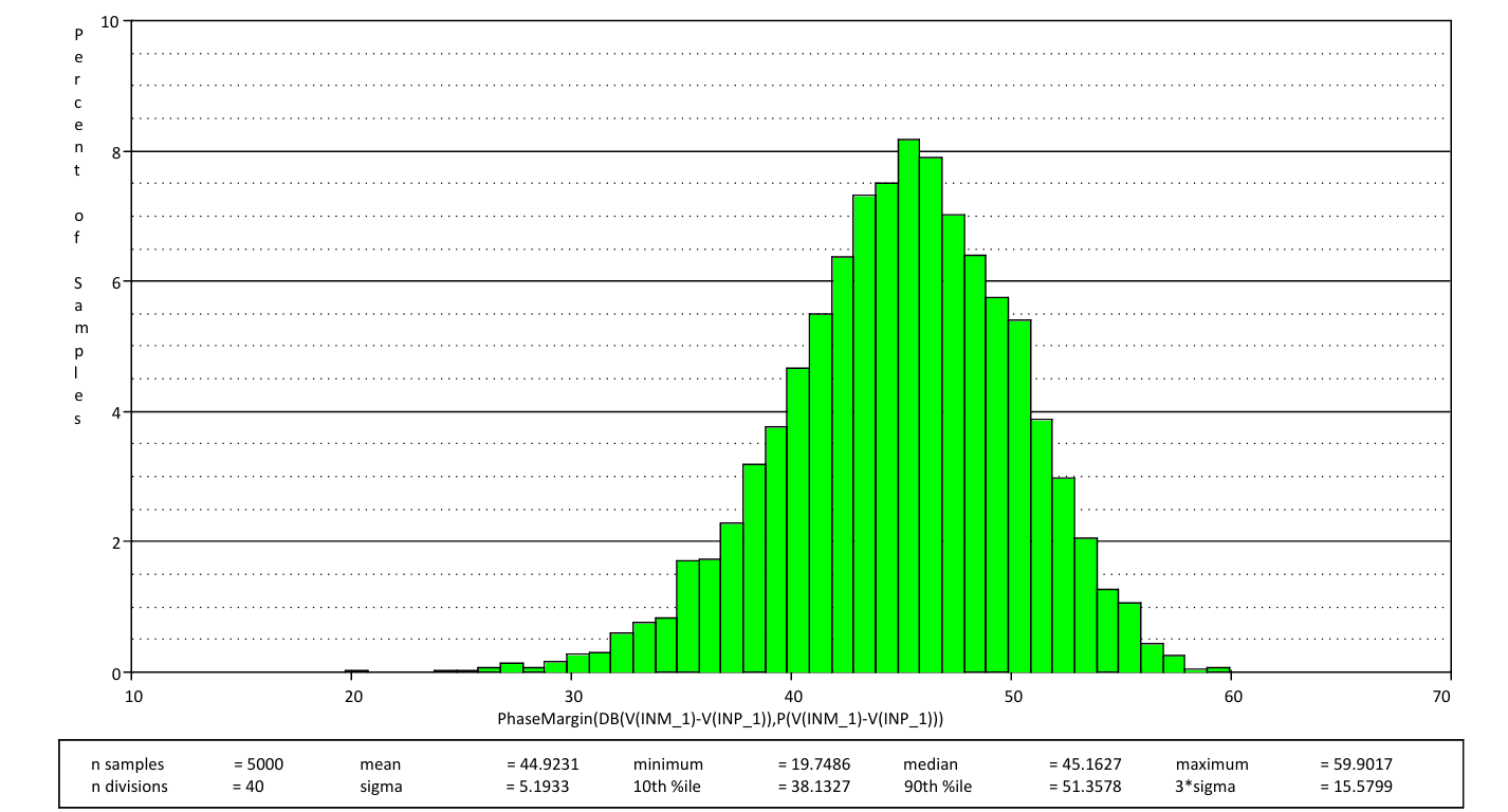 图 1 中的放大器由负载电阻和电容进行设置,以便反馈环路具有 45 度的相位裕度。通过对影响环路稳定性的主要因素(米勒电容器、开环输出阻抗和放大器周围的无源器件)进行 Monte Carlo 分析,可以估算工艺差异和温度变化对电路相位裕度的影响程度。