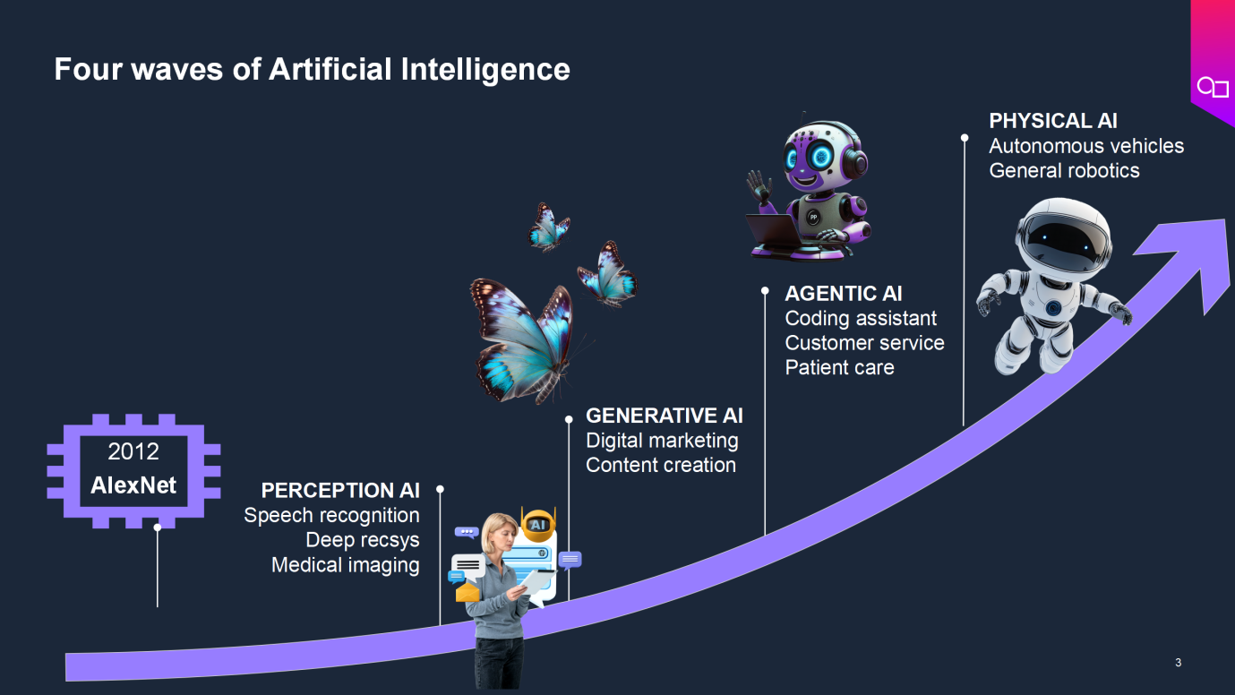 因此,在追求极致性能、功耗和面积(PPA)的模式之外,架构师们需要富有前瞻性地去选择高性能、高灵活性、可升级和开发者(生态)友好的架构。我们不妨先回顾AI发展的历程,从感知AI到生成式AI,再到智能体AI和物理AI,其应用场景不断拓展。在感知AI阶段,Al技术在语音识别、深度推荐系统和医学影像等领域取得显著进展;生成式AI在数字营销和内容创作方面发挥了重要作用;智能体AI为编程、客户服务、患者护理提供助力;物理AI推动了自动驾驶汽车和通用机器人发展。